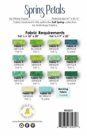 From Needle In A Hayes Stack By Hayes, Tiffany In Quilts This is fun and bright use of the beautiful green and blue shades of this glorious batik line. Fabric Featured in this quilt is the JDJ Soft Spring collection by Anthology Fabrics. Quilt finishes at 41 1/2" x 48".