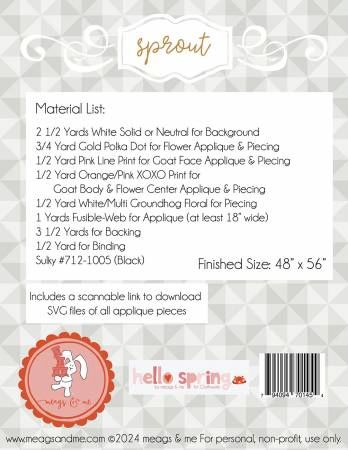 From Meags and Me In Quilts Sprout- a delightful goat amidst florals and pinwheels. Finished size: 48" x 56" Printed Paper Pattern Finished Size: 48in x 56in Final Product: Quilt Paper Templates Included Technique Used: Applique / Hand Embroidery / Stitchery Skill Level: Confident Beginner