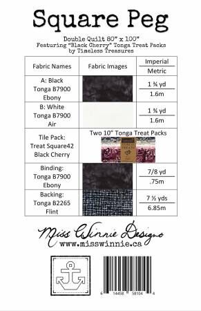 From Miss Winnie Designs By Bourque, Hanna In Quilts Ever feel like a Square Peg trying to fit into a round hole? This dynamic design knows how you feel! "Square Peg" is a unique way to feature 10" square packs. Two 10" square packs are needed per quilt. Finished quilt measures 80" x 100". Directions include cutting directions and many colourful diagrams. "Square Peg" is also fantastic for scraps! Printed Paper Pattern Finished Size: 80in x 100in Final Product: Quilt Technique Used: Standard Machine Sewing Skill Level: Beginner