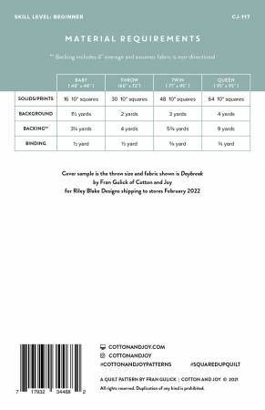 From Cotton and Joy By Gulick, Fran In Quilts The Squared quilt pattern is block-based, beginner-friendly pattern that is perfect for showing off your favorite prints! The pattern comes with multiple design layouts that use either 10in stackers or or yardage. Pattern includes multiple sizes: baby, throw, twin, and queen. Printed Paper Pattern Final Product: Quilt Finished Size: 60in x 72in Technique: Standard Machine Sewing Skill Level: Beginner