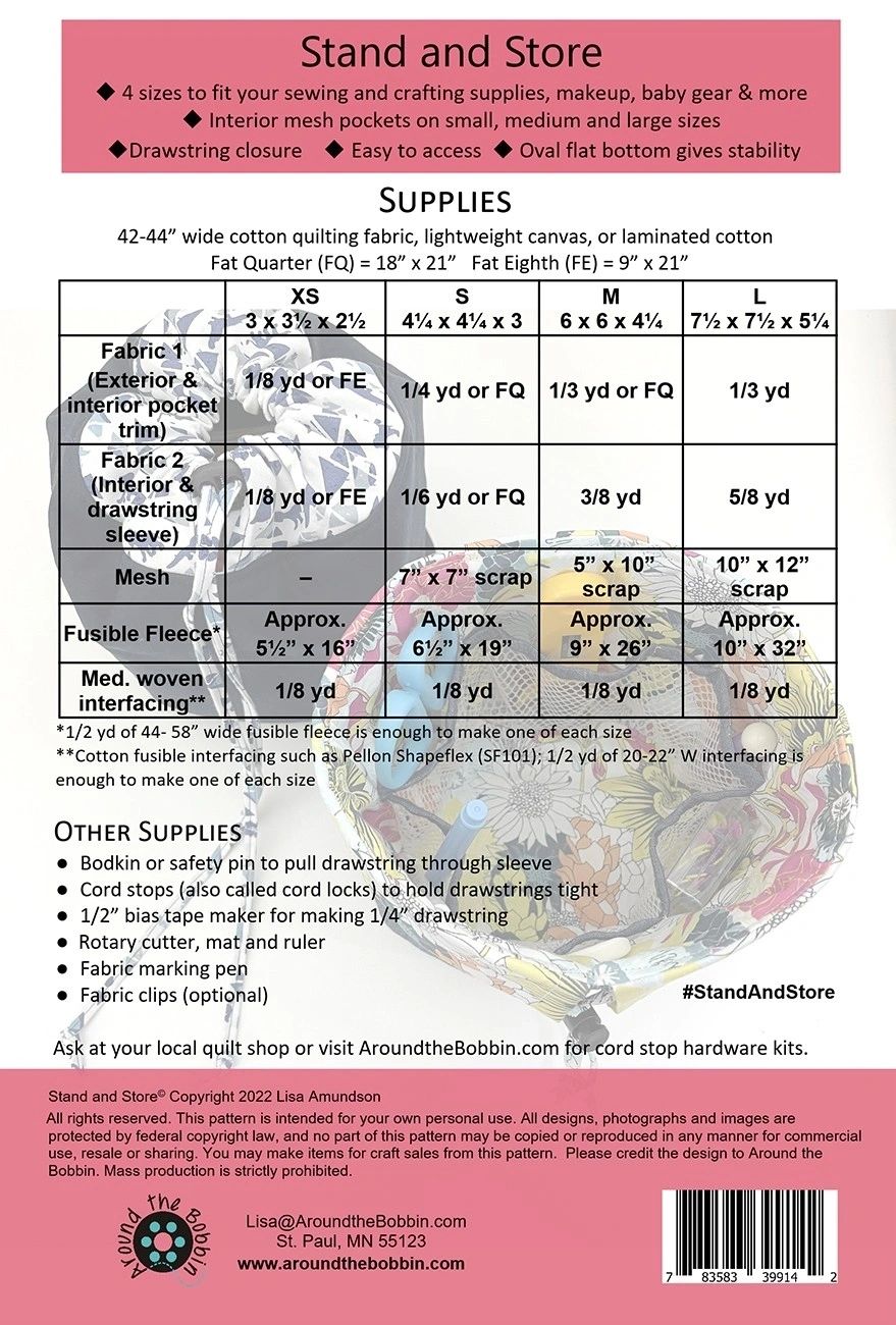 Adorable flat-bottomed baskets in 4 sizes for holding sewing and crafting supplies, makeup, baby gear & more. Interior mesh pockets on the small, medium and large sizes help keep things organized. Fold down drawstring sleeve for a cute contrasting band. Fold sleeve up to close with the drawstring for on-the-go storage. The medium and large sizes are a great place to start for confident beginners. Itty Bitty: 3 in H x 3-1/2 in W x 2-1/2 in D Small: 4-1/4 in H x 4-1/4 in W x 3 in D Medium: 6 in H x 6 in W x 4-1/4 in D Large: 7-1/2 in H x 7-1/2 in W x 5-1/4 in D Printed Paper Pattern Finished Size: Various Final Product: Bags/Purses/Totes Paper Templates Included Technique Used: Standard Machine Sewing Skill Level: Confident Beginner