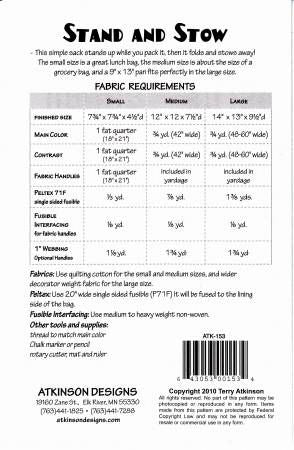 From Atkinson Designs By Atkinson, Terry In Bags, Purses, Totes & Electronic Covers This simple sack stands up when you pack it and then it folds and stows away. Small size makes a great lunch bag, medium size is about the size of a grocery bag, and a 9" x 13" pan fits perfectly in the large bag.