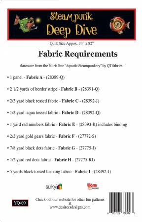 From Desiree's Designs In Quilts Our new Steampunk pattern, Deep Dive, uses our large panel from our Aquatic Steampunkery fabric line from QT Fabrics. This wonderful, large quilt goes together quickly and creates a wonderful, imaginary world of Aquatic Steampunk wonders. The quilt includes our story about how this special world came to be. This quilt and fabric line is already a best seller. Printed Paper Pattern Final Product: Confident Beginner Finished Size: 73in x 82in Technique: Piecing Skill Level: Confident Beginner