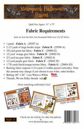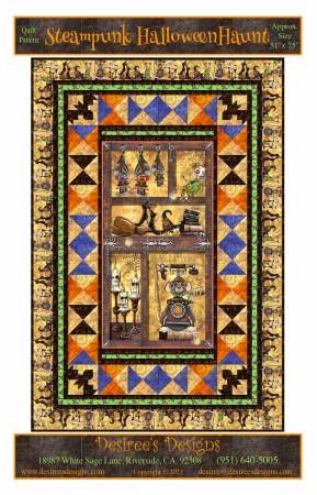 From Desiree's Designs By Habicht, Desiree In Quilts Desiree's latest Halloween Quilt pattern that was designed for her latest fabric line, Steampunk Halloween 2. Enjoy all the newest characters in this line like the Batty Bros., Ratonio Graham Bell and Prudence of course. Easy to assemble quilt using large stripes for borders can cute bat corners create this fun and whimsical Steampunk Quilt. Embroidery CD is also available Printed Paper Pattern Finished Size: 51in x 75in Final Product: Quilt Technique Used: Standard Machine Sewing Skill Level: Confident Beginner