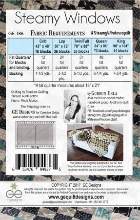 From G. E. Designs By Erla, Gudrun In Quilts Steamy Windows is a fun and fast quilt made with Fat Quarters. Sewing and cutting becomes a breeze when using the Stripology ruler. 5 sizes: Crib, Lap, Twin/Full, Queen, King.