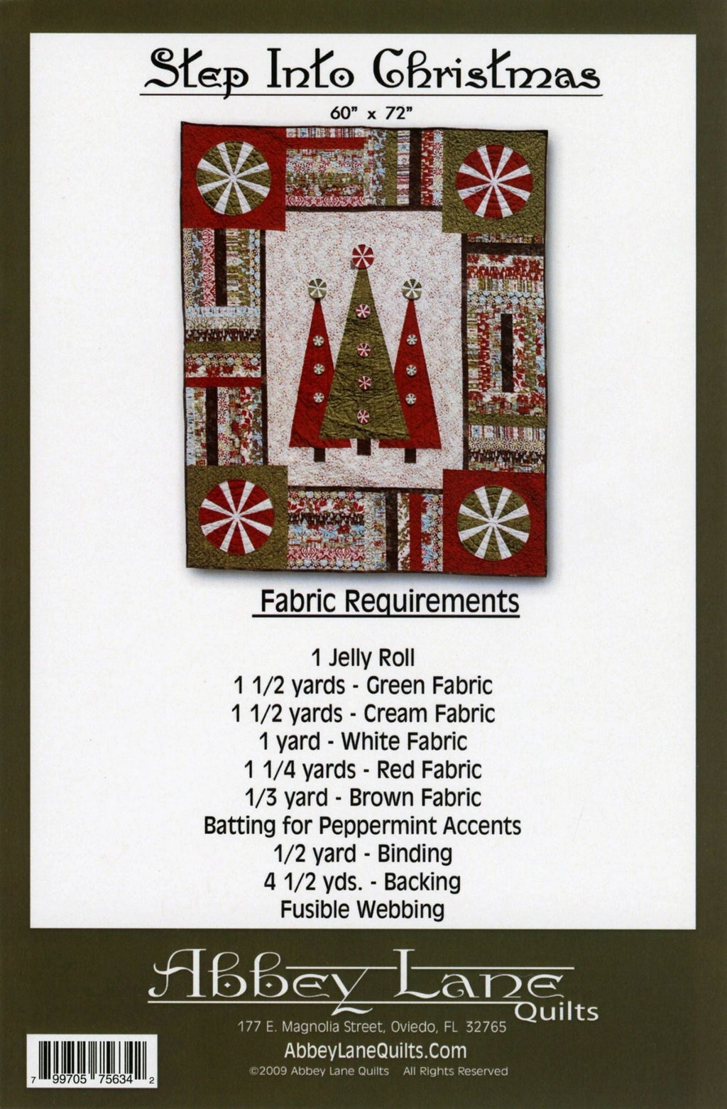 A jelly roll and some yardage make up this beautiful Christmas quilt. It is sure to be a classic with it's trees and peppermint candies. Check out the 3-D candy accents on the trees. STEP INTO CHRISTMAS will start your holiday season right. Printed Paper Pattern Finished Size: 60in x 72in Final Product: Quilt Technique Used: Standard Machine Sewing / Applique Skill Level: Confident Beginner