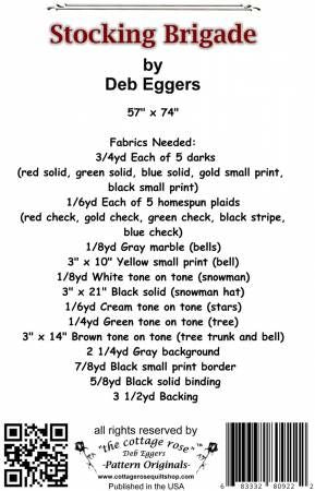 From Cottage Rose In Quilts There are 4 different stocking designs in this fun holiday quilt. It makes up to 57" x 64" and is all easy piecing Printed Paper Pattern Finished Size: 57in x 64in Final Product: Quilt Technique Used: Standard Machine Sewing Skill Level: Confident Beginner