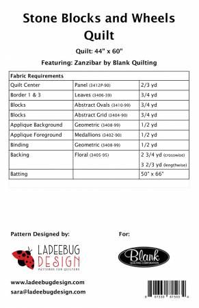 From Ladeebug Designs WRAPUPSALE_2024 Collection In Quilts Features Blank Quilting's Zanzibar collection. Finished size 44" x 60". This design uses a simple 4-patch block and two borders surrounding a panel and then steps it up a notch by adding two-layered applique circles. Fussy cutting the center circle finishes off the design.