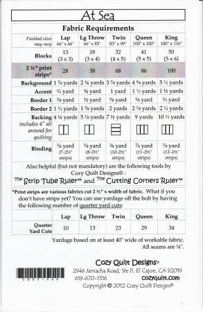 From Cozy Quilt Designs By Stout, Daniela In Quilts At Sea - A Cozy Strip Club Pattern Designed for 2½" Strips With just 2½” strips, some background and accent, you too can enjoy a day At Sea. This wondrous quilt looks much harder than it is - there's one simple block, twisted and turned and set on point. Best of all, the block uses the Strip Tube Technique to make it fast and easy. At Sea is made especially striking with the pieced setting triangles. Even those are not difficult thanks to the magic of the Cutting Corners Technique. A great (but not mandatory) gadget for this pattern is the Strip Tube Ruler by Cozy Quilt Designs®. The pattern includes instructions for: • Lap • Large Throw • Twin • Queen • King