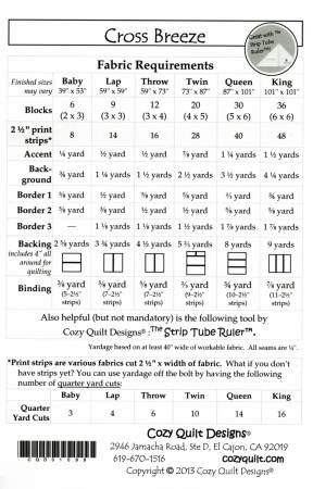 From Cozy Quilt Designs By Stout, Daniela In Quilts Cross Breeze - A Cozy Strip Club Pattern Designed for 2½" Strips. You can turn any strip bundle into a breath of fresh air with our Cross Breeze pattern just by adding a little background and an accent fabric. These simple yet stunning blocks are made even more wonderful with the brilliant tube technique. (Check out the The Strip Tube Ruler™ to make it even easier!) Fast, fun and easy as a breeze, this quilt will be sure to be a favorite go-to pattern! The pattern includes instructions for: • Baby • Lap • Throw • Twin • Queen • King