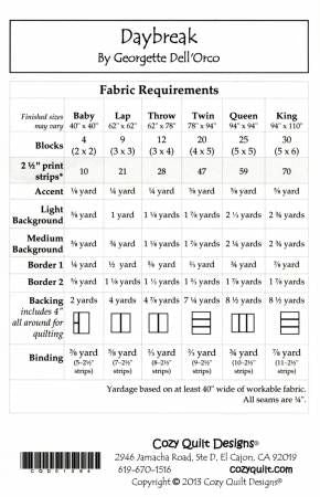 From Cozy Quilt Designs By Dell'Orco, Georgette In Quilts Day Break - A Cozy Strip Club Pattern Designed for 2½" Strips Start every morning off right with this cheerful yet sophisticated quilt pattern designed by Georgette Dell’Orco. Start with a bundle of 2 ½” strips, add some background fabrics, pick an accent, and do a little stitch-and-fold sewing technique (easy and fun)… then watch your fabrics transform into a brightly inviting quilt to welcome any new day! Choose bright colors like our sample, or use Asian prints for a Pacific Rim sunrise, 30’s or 40s prints for a nostalgic dawn, or even solids for a more contemporary start to your day. It’ll all be amazing in this wonderful Strip Club pattern! Cozy Chatter: To make that stitch-and-fold technique a little easier, we recommend using the Folded Corner Clipper - it's a Cozy Quilt Shop Favorite! The pattern includes instructions for: • Baby • Lap • Throw • Twin • Queen • King