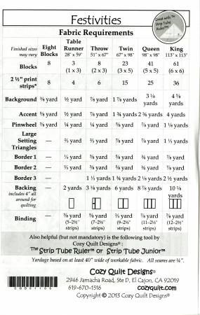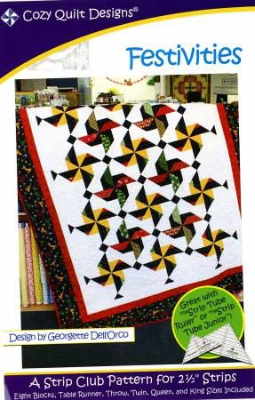 From Cozy Quilt Designs By Dell'Orco, Georgette In Quilts Festivities - A Cozy Strip Club Pattern Designed for 2½" Strips. Our Festivities pattern is a parcel of pinwheel fun! You'll be sure to enjoy creating this festive and charming quilt made of 2 ½” strips. With the Strip Tube Ruler #CQD05001 (or Strip Tube Junior #CQD05006) you can make the wonderful pinwheels easily and efficiently. (If you don’t have the ruler, don‘t worry, there are directions in the pattern for a regular square up ruler). An instant classic, Festivities was designed with the holiday spirit in mind, but it works well any time of the year by just using different fabrics! The pattern includes instructions for: Table Runner 28in x 59in Throw, Twin 67in x 98in Queen 98in x 98in King 113in x 113in