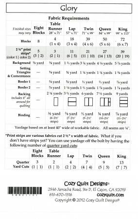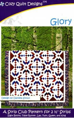 From Cozy Quilt Designs By Stout, Daniela In Quilts Glory - Enjoy another wonderful way to show off 2 ½” strips with this fantastic Strip Club Pattern. This strikingly handsome quilt is a great way to create a two-color masterpiece. Our sample uses red and blue, but you can use any color combination. OR, you can choose to go completely scrappy and have an equally beautiful quilt. In typical Cozy style, we have created a quilt from one simple repeating block assembled with the easy stitch and flip technique. The magic is the setting and the twisting and turning of that block! The pattern includes instructions for: Table Runner 28in x 71in Lap 57in x 71in Twin 71in x 99in Queen 84in x 99in King 99in x 113in