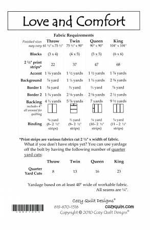 From Cozy Quilt Designs By Stout, Daniela In Quilts Love and Comfort - A Cozy Strip Club Pattern Designed for 2½" Strips Sometimes you just need a little love and comfort. This quilt, with a classic heart center, is just the ticket to give you a little of both. This is a great quilt to use pink! The pattern includes instructions for: • Throw • Twin • Queen • King