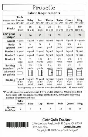 From Cozy Quilt Designs By Stout, Daniela In Quilts Pirouette - A Cozy Strip Club Pattern Designed for 2½" Strips An immediate favorite, Pirouette is the perfect project for any strip bundle. In simple Cozy style, the quilt is made from one block that is twisted and turned to create the charming effect. Just add accent and background fabrics and you are on your way. As if twirling on tiptoe, the blocks are both delicate but strong, simple yet the elegant. So, with some easy strip piecing and some stitch and flip work you too can have a graceful masterpiece. The pattern includes instructions for: • Table Runner • Baby • Lap • Throw • Twin • Queen • King