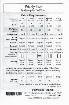 From Cozy Quilt Designs By Dell'Orco, Georgette In Quilts Prickly Pear - A Cozy Strip Club Pattern Designed for 2½" Strips Strips turn into something magical in this quilt created by our top-selling designer, Georgette Dell'Orco. With a strong background and a subtle accent, a simple block set on point becomes wonderfully striking. Check out the small detail of the setting triangles peeking into the blocks to create a diamond effect. So nice! The pattern includes instructions for: • Lap • Throw • Twin • Queen • King