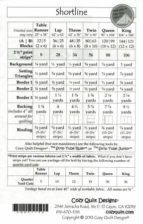 From Cozy Quilt Designs By Stout, Daniela In Quilts Shortline - A Cozy Strip Club Pattern Designed for 2½" Strips What do you get when you cross the two easiest piecing techniques of the tube technique and the split rail fence? The answer is a terrific pattern from Cozy Quilt Designs called Shortline! With simple and fun blocks, the piecework goes together quickly. And with the on-point setting, the quilt stands out beautifully. With so much going for it, Shortline is sure to become the go-to pattern for any strip set! The blocks are made even easier with the Strip Tube Rulers. You can use either the original The Strip Tube Ruler™ or the smaller and more convenient The Strip Tube Junior™ with this pattern. Do you like the fabrics in our cover photo? Click here to view our pre-cut strips and any available coordinate fabrics that we used for our shop samples. The pattern includes instructions for: • Table Runner • Lap • Throw • Twin • Queen • King