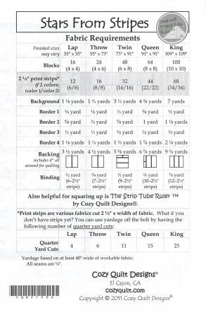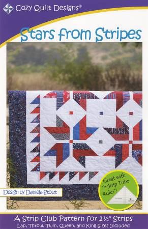 From Cozy Quilt Designs By Stout, Daniela In Quilts Stars From Stripes - A Cozy Strip Club Pattern Designed for 2½" Strips With some ingenious piecework you can turn stripes (or strips)into a wonderful star quilt. The border element is even made with the leftover fabrics from the block piecework. This wonderful design makes a classically stunning quilt, and the Strip Tube Ruler™ makes it a breeze! The pattern includes instructions for: • Lap • Throw • Twin • Queen • King