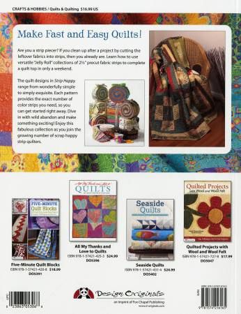 From Design Originals By McNeill, Suzanne In Quilting - General Are you a strip piecer? If you clean up after a project by cutting the leftover fabrics into strips, then you already are. Learn how to use versatile "Jelly Roll" collections of 2-1/2 in precut fabric strips to complete a quilt top in only a weekend. The quilt designs in Strip Happy range from wonderfully simple to simply exquisite. Each pattern provides the exact number of color strips you need, so you can get started right away. Dive in with wild abandon and make something exciting! Enjoy this fabulous collection as you join the growing number of scrap happy strip quilters. Pages: 50 Author: Suzanne McNeill Publish Date: 01/01/2007 Dimensions: 8.5in x 0.14in x 11in Softcover