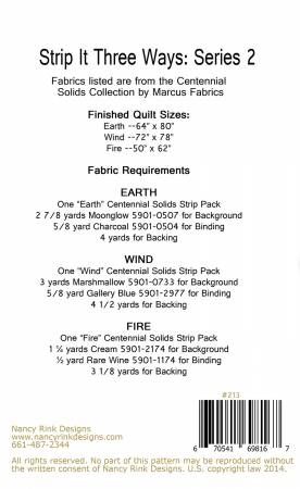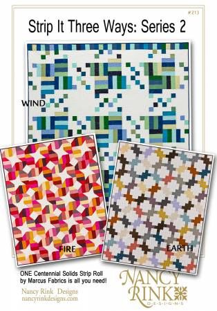 From Nancy Rink Designs By Rink, Nancy In Quilts Make any one of three quilts with a single jelly roll and a background fabric. Earth: 64 x 80"; 2 7/8 yds background needed Wind: 72 x 78"; 3 yds background needed Fire: 50" x 62"; 1 1/4 yds background needed