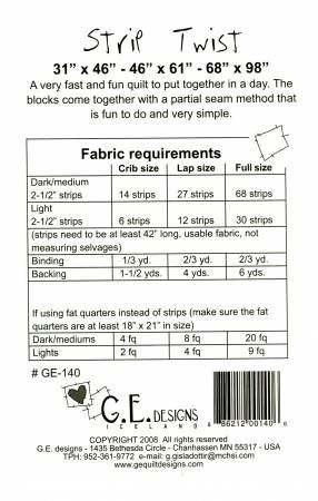 From G. E. Designs By Erla, Gudrun In Quilts A really fast quilt done with a simple partial piecing method. The lap size quilt uses 1 Jelly Roll only. The instructions include three different sizes, Crib Size, Lap size and Twin size.