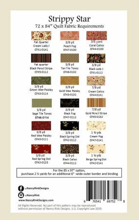 From Nancy Rink Designs In Quilts Strip pieced Lone Star in two sizes: 72 x 84 & 85 x 97 Features the Tarrington collection Pattern is full color and packaged in a clear zip bag