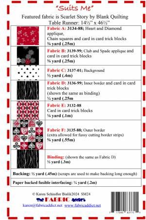 From Fabric Addict By Schindler, Karen In Placemats, Table Runners & Toppers Suits Me table runner pattern. Easy applique, using paperbacked fusible web. Features Scarlet Story by Blank Quilting. Printed Paper Pattern Finished Size: 14-1/2in x 46-1/2in Final Product: Table Runner / Table Topper / Placemat Paper Templates Included Technique Used: Applique / Standard Machine Sewing Skill Level: Confident Beginner