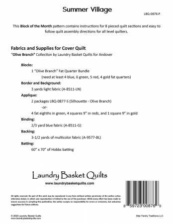 From Laundry Basket Quilts By Sitar, Edyta In Quilts BOM Quilt Pattern made using our "Olive Branch" fabric collection by Andover. Applique in Summer Village uses 2ea Silhouettes - Olive Branch. Finished quilt size is 54" x 66.5".