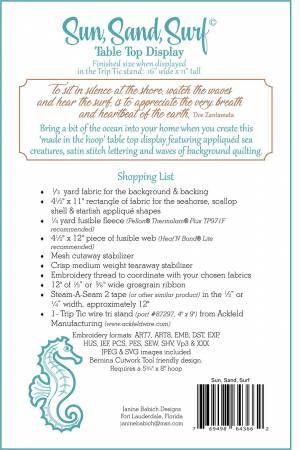 From Janine Babich Designs By Babich, Janine In Placemats, Table Runners & Toppers Bring a bit of the ocean into your home when you create this Made in the Hoop table top display featuring appliqued sea creatures, satin stitch lettering and waves of background stitching. Finished size when displayed: 16" x 11" Includes embroidery formats: ART7, ART8, EMB, DST, EXP, HUS, JEF, PCS, PES, SEW, SHV, VP3 & XXX. JPEG & SVG files included. Requires a 5 3/4" x 8" hoop.