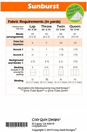 From Cozy Quilt Designs By Stout, Daniela In Quilts Half-Square Triangles with Ease! Sunburst is simple, yet bursting with possibilities! The classic pinwheels are made easily with the Strip Tube Ruler and half-square triangles. This quilt is a great way to play with color and can be made modern with a white background and bright colors, or traditional with your favorite prints. The pattern includes instructions for: • Lap • Throw • Twin • Queen