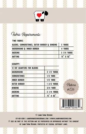 From Lamb Farm Designs By Lamb, Jennie Jo In Quilts Generous lap quilt or bed quilt. This pattern contains fabric requirements for either a two-color quilt or a scrappy version made with fat quarters. Large blocks make for a quicker finish. Fat quarter friendly. Great for a confident beginner. Directions step by step with great graphics and all pressing directions included. Printed Paper Pattern Finished Size: 67in x 84in Final Product: Quilt Technique Used: Standard Machine Sewing Skill Level: Confident Beginner