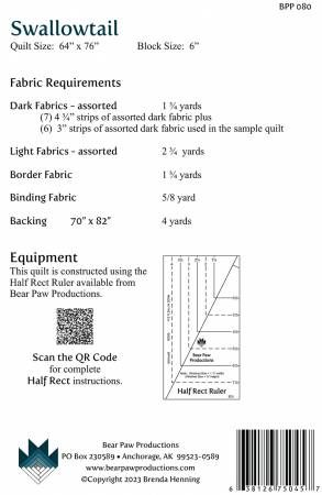 Swallowtail is an intriguing design that creates movement across the quilt. This pattern is designed to use BPP HRR Half Rect Ruler to create half rectangle units. A paper template is printed in the pattern, but the ruler makes trimming so much easier. Full color instructions. Printed Paper Pattern Finished size: 64in x 76in Final Product: Quilt Paper Templates Included Technique Used: Standard Machine Sewing Skill Level: Confident Beginner