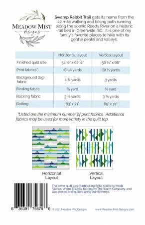 From Meadow Mist Designs By Brickey, Cheryl In Quilts Swamp Rabbit Trail gets its name from the 22 mile walking and biking path running along the scenic Reedy River on a historic rail bed in Greenville, SC. It is one of my family’s favorite places to hike with its gentle peaks and valleys. The Swamp Rabbit Trail block looks more complicated than it really is, with the “peaks” being stitched using traditional flying geese techniques. Swamp Rabbit Trail contains piecing instructions for two different throw sized layouts, a horizontal layout and a vertical layout. Each layout uses the same number and size of blocks but differs in the block orientation, sashing, and borders. Printed Paper Pattern Finished Size: 54-1/2in x 62-1/2in, 56-1/2in x 66in Final Product: Quilt Technique Used: Standard Machine Sewing Skill Level: Confident Beginner
