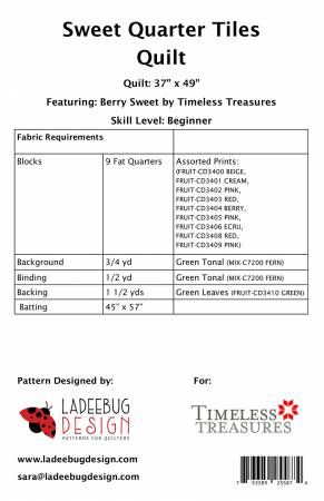 From Ladeebug Designs In Quilts Features Timeless Treasures' Berry Sweet collection. Finished size: 37" x 49". Confident Beginner - skinny pieces and asymmetrical layout. The blocks are put together with a white strip on the top and right side of every patch. The quilt is then assembled in asymmetrical sections. The final step is to add a full-length border to the left side and bottom of the quilt only. This design could easily be doubled to create a single bed quilt or quadrupled to create a queen bed quilt.