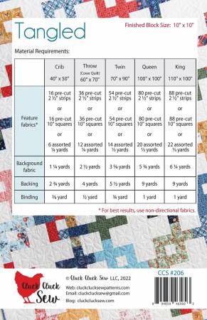 From Cluck Cluck Sew By Harris, Allison In Quilts Tangled is a beginner friendly pattern that includes Crib, Throw, Twin, Queen, and King sizes. It can be made with pre-cut 2 1/2" strips, or pre-cut 10" squares, or yardage. The Throw size can be made with one Jelly Roll or Layer Cake. Printed Paper Pattern Finished Size: Various Final Product: Quilt Technique Used: Standard Machine Sewing Skill Level: Beginner