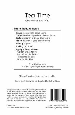 From Laundry Basket Quilts By Sitar, Edyta WRAPUPSALE_2024 Collection In Quilts "Tea Time" Raw Edge Laundry Basket Quilts Pattern using Laundry Basket Quilts "Cloud Nine" fabric collection. Quilt Size is 12" x 32" Printed Paper Pattern Finished size: 12in x 32in Final Product: Wall Hanging Paper Templates Included Technique Used: Applique & Standard Machine Sewing Skill Level: Any Level