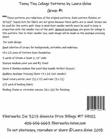 From Fiberworks Inc By Heine, Laura In Quilts Teeny Tiny Collage Patterns Group #1 by Laura Heine. These patterns are reductions of the original patterns for The Dress, Fish and Elephant. Fun size and can be finished with binding and hung on a wall or stretched on a canvas frame. Color instructions and all three patterns included. Size 16in x 20in.