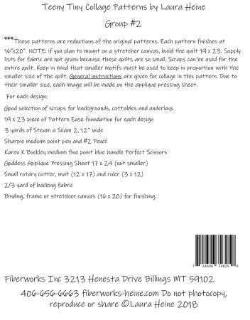 From Fiberworks Inc By Heine, Laura In Quilts Teeny Tiny Collage Patterns Group #2 by Laura Heine. These patterns are reductions of the original patterns for Old Blue (truck), Freida (fox) and Abilene (cow). Fun size and can be finished with binding and hung on a wall or stretched on a canvas frame. Color instructions and all three patterns included. Size 16in x 20in.