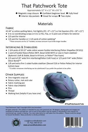From Around the Bobbin By Amundson, Lisa In Bags, Purses, Totes & Electronic Covers This scrap-buster tote pattern uses 6-12 fabrics on the exterior. Fat eighths and fat quarter friendly. Great for an introductory class for patchwork and/or bag making. There are 2 versions of the tote in the pattern. Version A has strips that are equal widths that meet in the middle while Version B’s strips are offset for easier piecing. Handles can be made from webbing or sewn using the directions in the pattern. Magnetic snap closure and easy interior slip pockets. Confident beginner level. The finished size is 12 in H x 11 in W (bottom) x 3 ½ in D. Printed Paper Pattern Finished Size: 12in x 11in x 3-1/2in Final Product: Bags / Purses / Totes Technique Used: Standard Machine Sewing Skill Level: Confident Beginner
