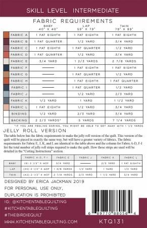 From Kitchen Table Quilting By Jackman, Erica In Quilts The Birdie Quilt Pattern is a great, unique way to show off your favorite fabrics and has the option to use a jelly roll The pattern includes instructions for baby size (40" x 40"), lap size (59" x 79"), and twin size (79" x 99") quilts.