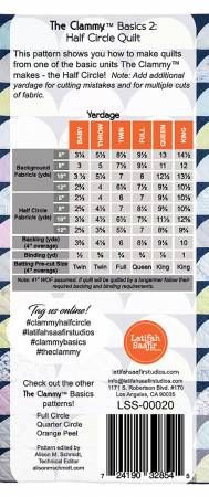 From Latifah Saafir Studios LLC In Quilts The Clammy Basics 2: Half Circle Quilt pattern shows you how to sew quilts using The Clammy templates to make the Half Circle quilt block. Half Circle quilt blocks are a great shape with a lot of possibilities. This pattern gives all measurement as well as cutting and sewing directions to make baby to king size quilts using either The Clammy 6", 8", 10" or 12".