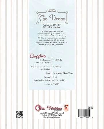 The perfect gift for a bride, to commemorate a special occasion, or made in a fashionista's favorite color. The Dress is a quick and easy applique pattern, including a full size layout diagram, reversed templates, and optional numbers to add that special date. Finished size: 28in x 42in.