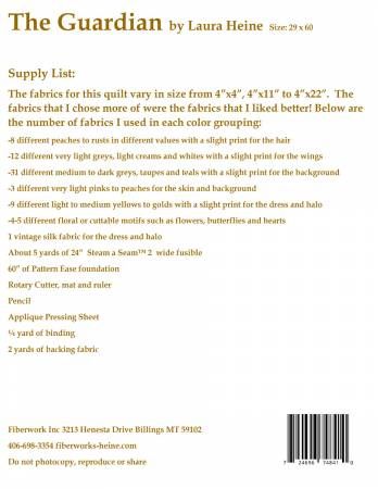 From Fiberworks Inc By Heine, Laura In Quilts The Guardian, angel collage pattern by Laura Heine features full sized pattern and complete step by step color photos and instruction on how to construct this painterly collage. Size 29in x 60in. Pattern also includes a bonus mini angel pattern.