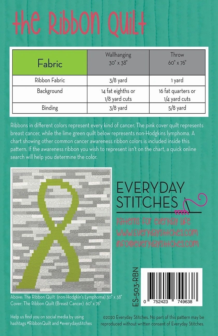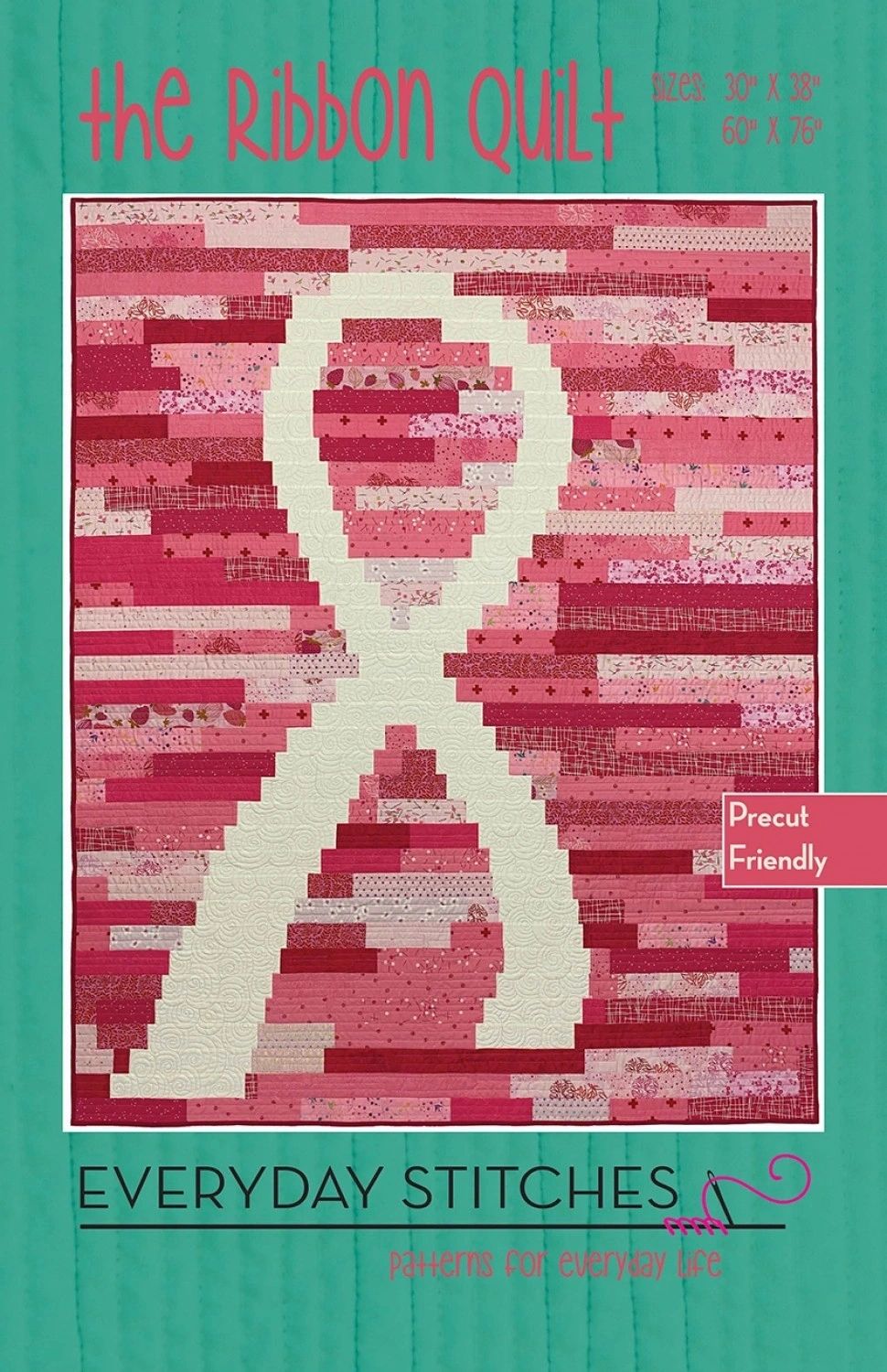 From Everyday Stitches In Quilts The Ribbon quilt wall hanging is a beautiful tribute to the cancer survivor in your life, while the throw size is perfect to comfort your loved one while going through treatment.The quilt is simply pieced using 2-1/2" strips for the throw and 1-1/2" strips for the wall hanging. Gather your scraps and get stitching! A chart of common types of cancers and their ribbon colors is included. All Everyday Stitches patterns are thoughtfully created and thoroughly tested for accuracy and fun! Sizes: 30 x 38 60 x 76