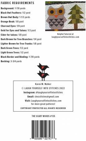 From Laugh Yourself Into Stitches By Walker, Karen In Quilts The Scary Woods is not really scary at all! Sweet fluffy owls perched on branches with checkerboard trees. You can just see the light flickering in through the thick wooded forest! Large blocks make this an easy quilt to make with nothing too difficult. There is a link provided in the instructions for a step by step pictorial to assist with the small rounded areas on either side of the owl's eyes. All piecing methods are tradtional including the Magic 8 method of making 8 half square triangles using only 2 fabric squares which is shared inside the written instructions. Clear diagrams are included to assist with the written instructions. Would make a terrific class, teaching the owl and the tree block one week and returning the following week or two to sew the rows together and add the sashing branches. The Scary Woods quilt measures 58" x 72".