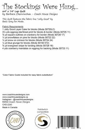 From Coach House Designs By Cherniwchan, Barbara In Quilts 64" x 74" Christmas quilt featuring Jolly Good fabric line by Basic Grey. Uses a layer cake and depicts Christmas stockings and ornaments Printed Paper Pattern Finished Size: 64in x 74in Final Product: Quilt Technique Used: Standard Machine Sewing Skill Level: Confident Beginner