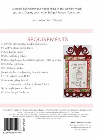 From Hugs 'n Kisses In Wall Hanging A simple but meaningful wallhanging to say just how much you care. Display on a timber bell pull hanger/footer pair. Iron-on transfer included