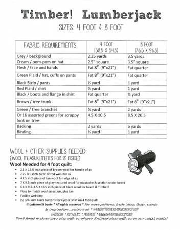 From Buttermilk Basin By West, Stacy In Quilts TIMBER! We love this big guy! Timber Lumberjack features a lumberjack with amazing quilt diagrams so this pattern is a breeze to make. Don't you just love him? This a full page pattern and he can be made 4ft or 8ft tall. Finished sizes: 76-1/2in x 96-1/2in and 38-1/2in x 54-1/2in.