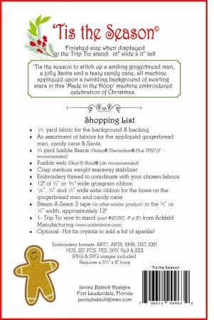 From Janine Babich Designs By Babich, Janine In Placemats, Table Runners & Toppers ‘Tis the season to stitch up a smiling gingerbread man, a jolly Santa and a tasty candy cane, all machine appliquéd upon a twinkling background of swirling stars in this ‘Made in the Hoop’ machine embroidered celebration of Christmas. Finished size when displayed in the trip tic stand: 16" x 11". Requires a 5 3/4" x 8" hoop and includes embroidery formats ART7, ART8, EMB, EXP, DST, HUS, JEF, PCS, PES, SHV, VP3 & XXX. SVG & JPEG images included. Digital Download Code Final Product: Table Top Display Finished Size: 11in x 16in Technique: Machine Embroidery