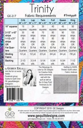 From G. E. Designs By Erla, Gudrun In Quilts Trinity is a part of the Stripology Mixers pattern series where multiple sizes of precuts are used along with the Stripology XL ruler. Trinity uses 10" squares, 2-1/2" and 1-1/2" strips. Pattern offers 6 sizes: Crib, Lap, Twin, Full, Queen and King.